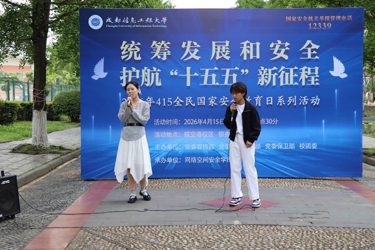 2026年4月15日,是第十一个全民国家安全教育日,成都信息工程大学紧扣“统筹发展和安全,护航‘十五五’新征程”主题,顺利开展415全民国家安全教育专项行动。本次活动由党委宣传部、党委学生工作部、党委保卫部、校团委主办,网络空间安全学院承办。