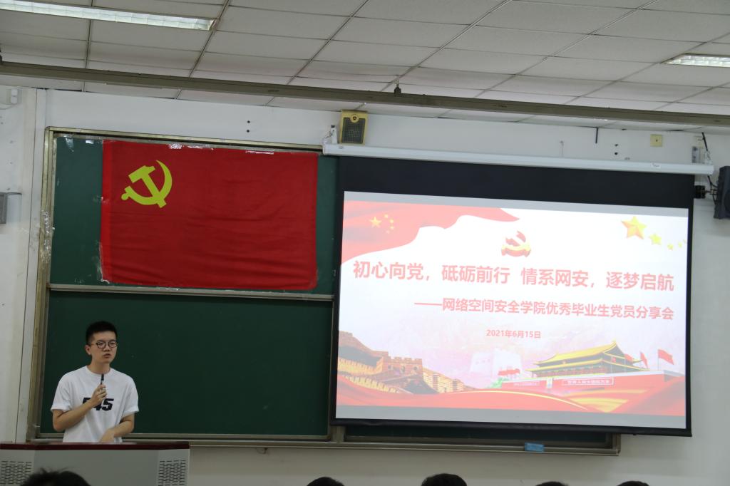 为帮助学生党员和入党积极分子在人生成长和职业发展进行更好地规划,明确自身前进的方向,信息安全学生党支部于2021年6月15日下午14时开展了以”初心向党,砥砺前行,情系网安,逐梦启航”为主题的毕业生党员分享会。此次分享会邀请了王皓宇,任官荣,杨亚东,唐逸帆,赵丹阳5位优秀毕业生党员作为分享嘉宾会议由组织委员张昊昱主持,信息安全学生党支部全体成员以及部分大一大二入党积极分子参与此次会议。