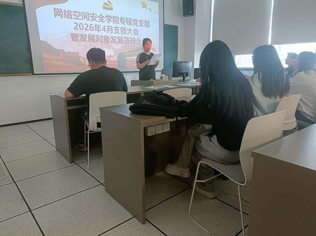 为切实推动学生党员教育常态化、精准化,提升学生党员的政治素养与实践能力,筑牢青年党员服务校园、助力国家发展的思想根基,4月9日,本着公平、公正、公开的原则,网络空间安全学院专硕党支部在芯谷校区4-2栋323会议室召开4月组织生活会以及入党积极分子列为发展对象答辩会。此次答辩会由专硕党支部副书记刘静雯主持,专硕党支部书记郭海琴及专硕党支部全体党员参加。