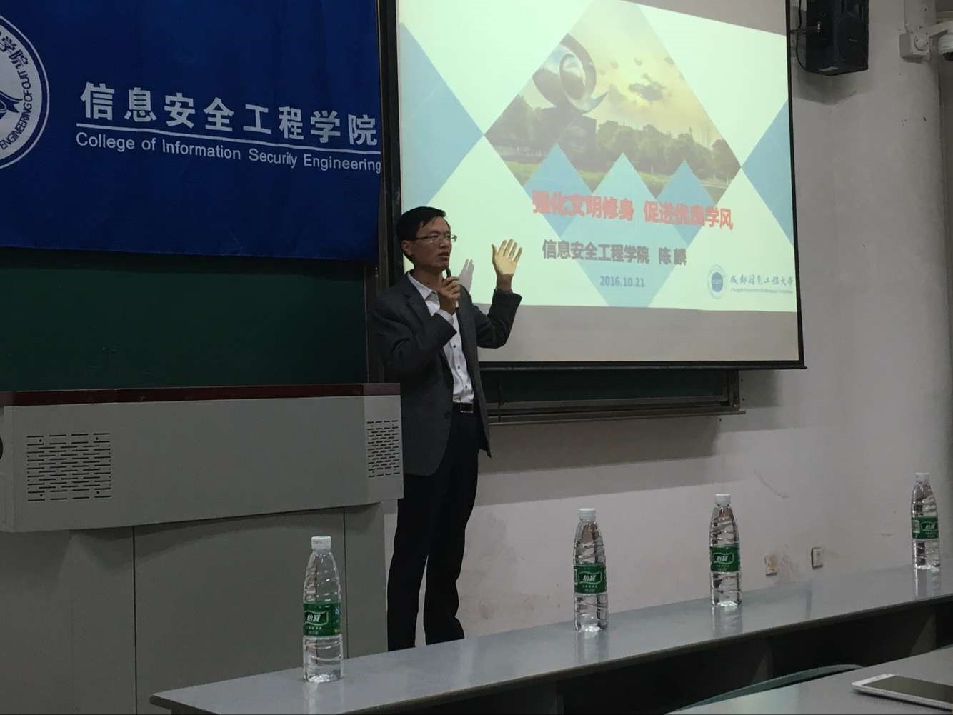 桐花万里丹山路,雏凤修身树新风。为培养学生良好的综合素质,2016年10月21日中午12时20分,信息安全工程学院分团委学生会所有干部、干事;2014-2016级所有班长、学习委员;2016级所有纪检委员于4112召开了“强化文明修身,促进优良学风”主题工作会。本次主题会议由我院辅导员张琴老师主持,党总支书记陈麟主讲。