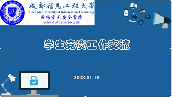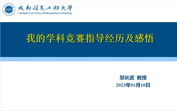 2023年1月10日,网络空间安全学院于线上举行《学生竞赛工作交流》讲座。邀请学校资源环境学院邹长武教授进行此次讲座分享,主要就学生竞赛工作经验交流。学院领导与部分师生参加讲座并进行深入交流探讨。