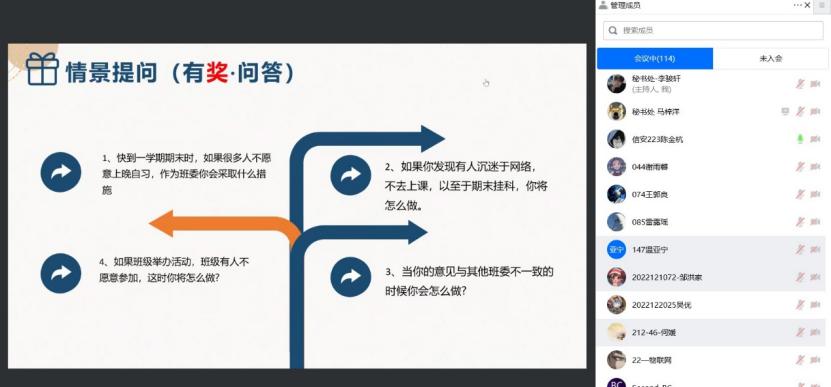据悉,本次参会的网络空间安全学院2022级班委共103位,报到率为99%,交流会整体稳定有序。其中设立了有奖问答环节,各班班委积极响应,带来许多精彩的回答。问答环节过后,陈智勇书记结合自身工作经验,为2022级班委讲述自己对于这些问题的看法,提供了更多的工作思路。