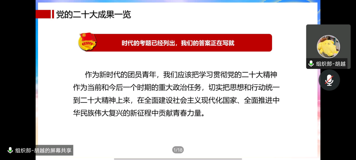 团课还详细介绍了如何成为新时代合格团员。作为一名合格的新时代团员,我们要有自律和慎独的意识,树立自立自强的意识,有创新和竞争精神,奋勇建功新时代。最后,团课以党的二十大成果介绍以及对学员的展望迎来尾声。