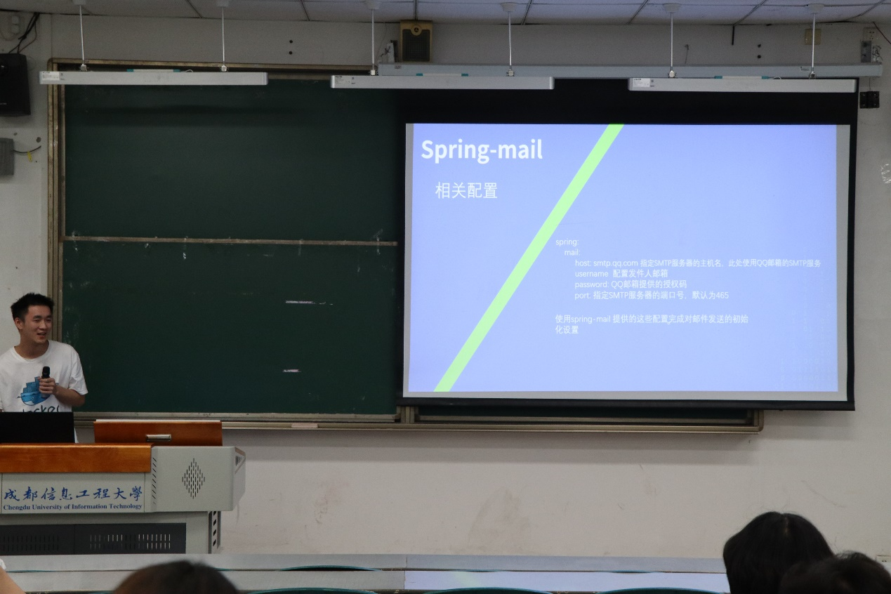 接下来,是任欢同学为我们分享有关Spring-maild的知识,深入浅出得讲解了如何利用Spring-mail+thymeleaf实现邮箱验证的发送。