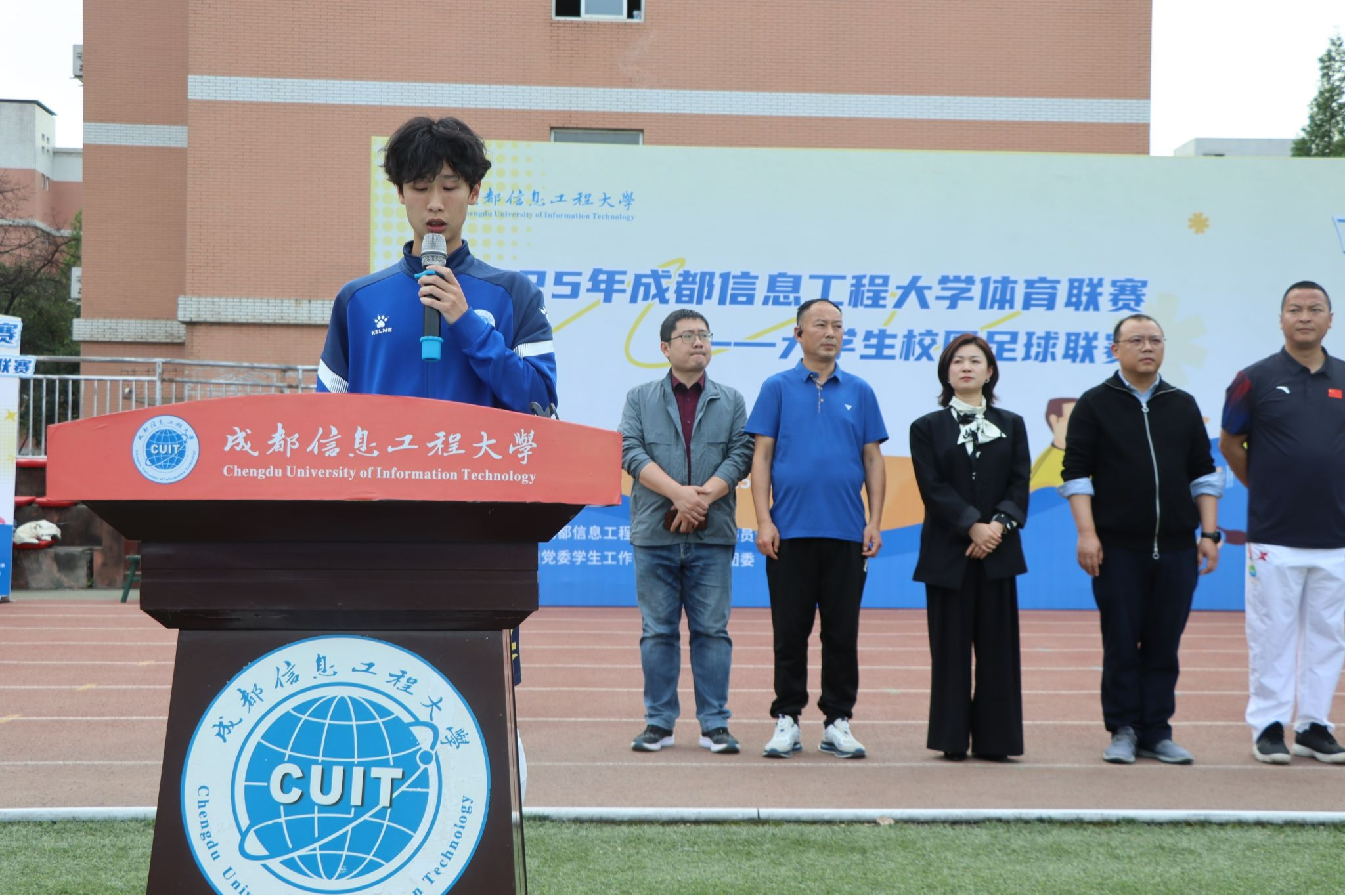 四月蓉城春意正浓,成信校园战鼓擂动。2025年4月14日,成都信息工程大学体育联赛开幕式在第一田径场盛大启幕。网络空间安全学院院长周益民、团委书记夏焜、教师彭承宗及辅导员韩阳等出席仪式,网络242班李修一代表全体运动员进行发言。