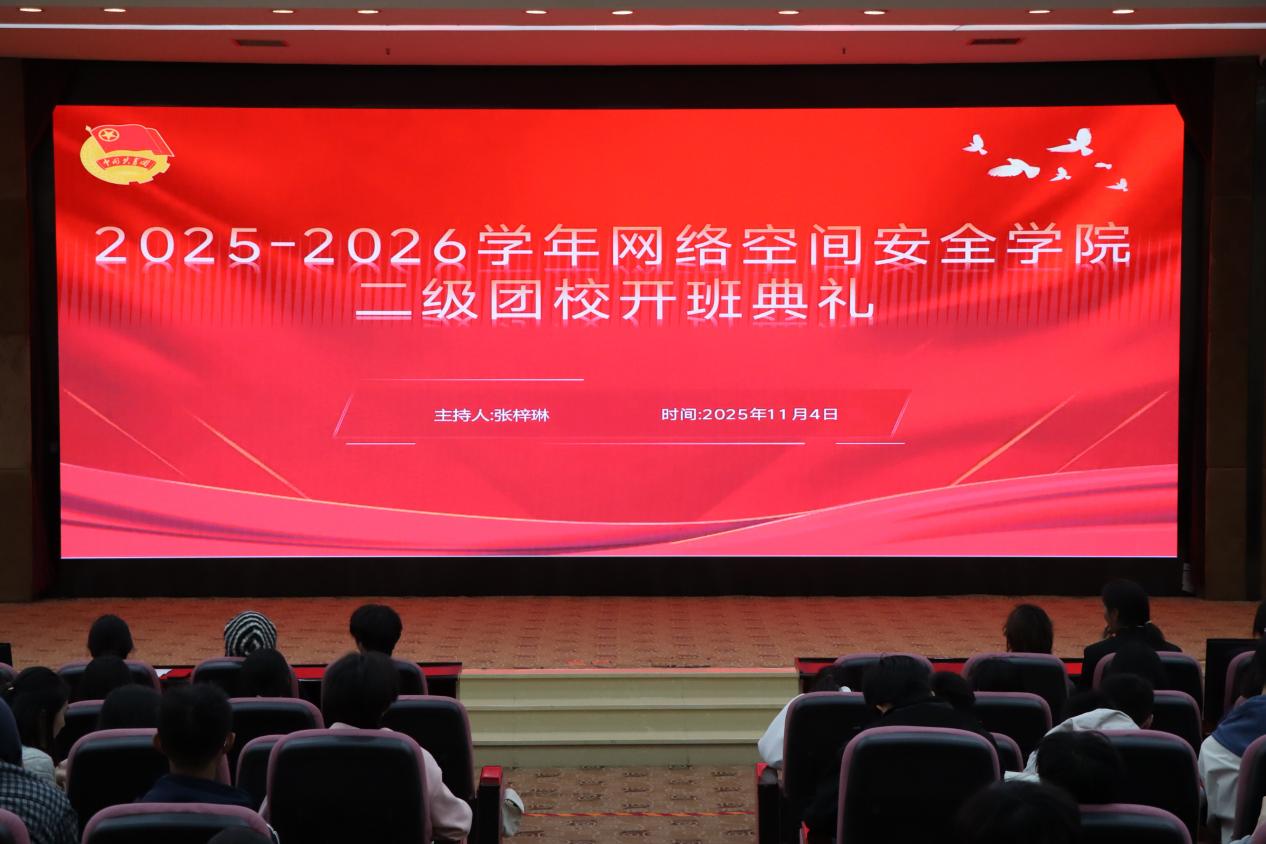 2025年11月4日,网络空间安全学院2025-2026学年二级团校开班仪式暨首场主题团课于国际会议厅顺利举行。本次仪式由学院团委组织部干事张梓琳主持,学院辅导员韩阳、团委副书记唐亚鑫出席仪式。