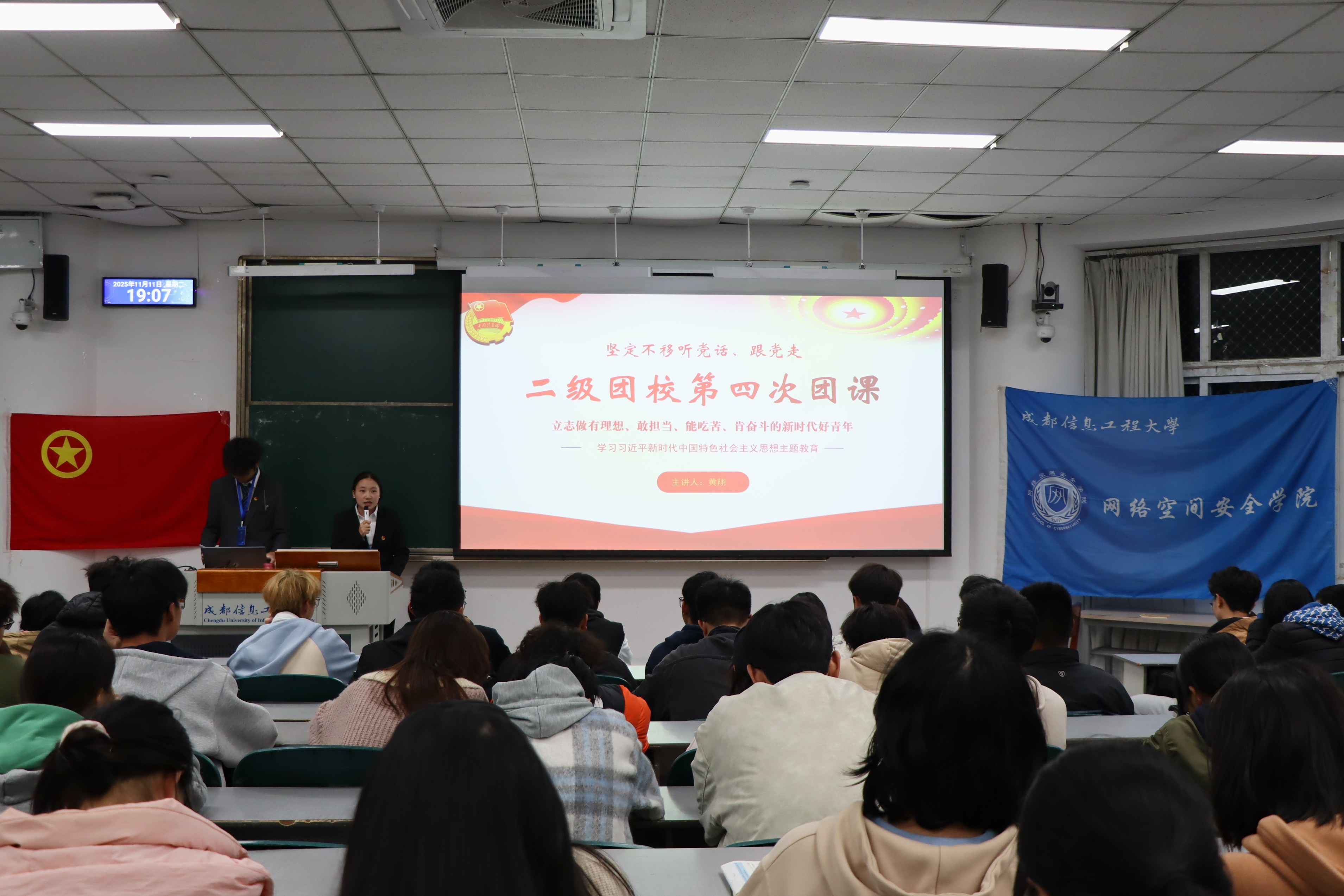 2025年11月11日晚,网络空间安全学院2025—2026学年二级团校第四次团课在H4112开展。本次团课以“励志做有理想、敢担当、能吃苦、肯奋斗的新时代好青年”为主题,由组织部干事黄翔主讲,全体团校学员参加。