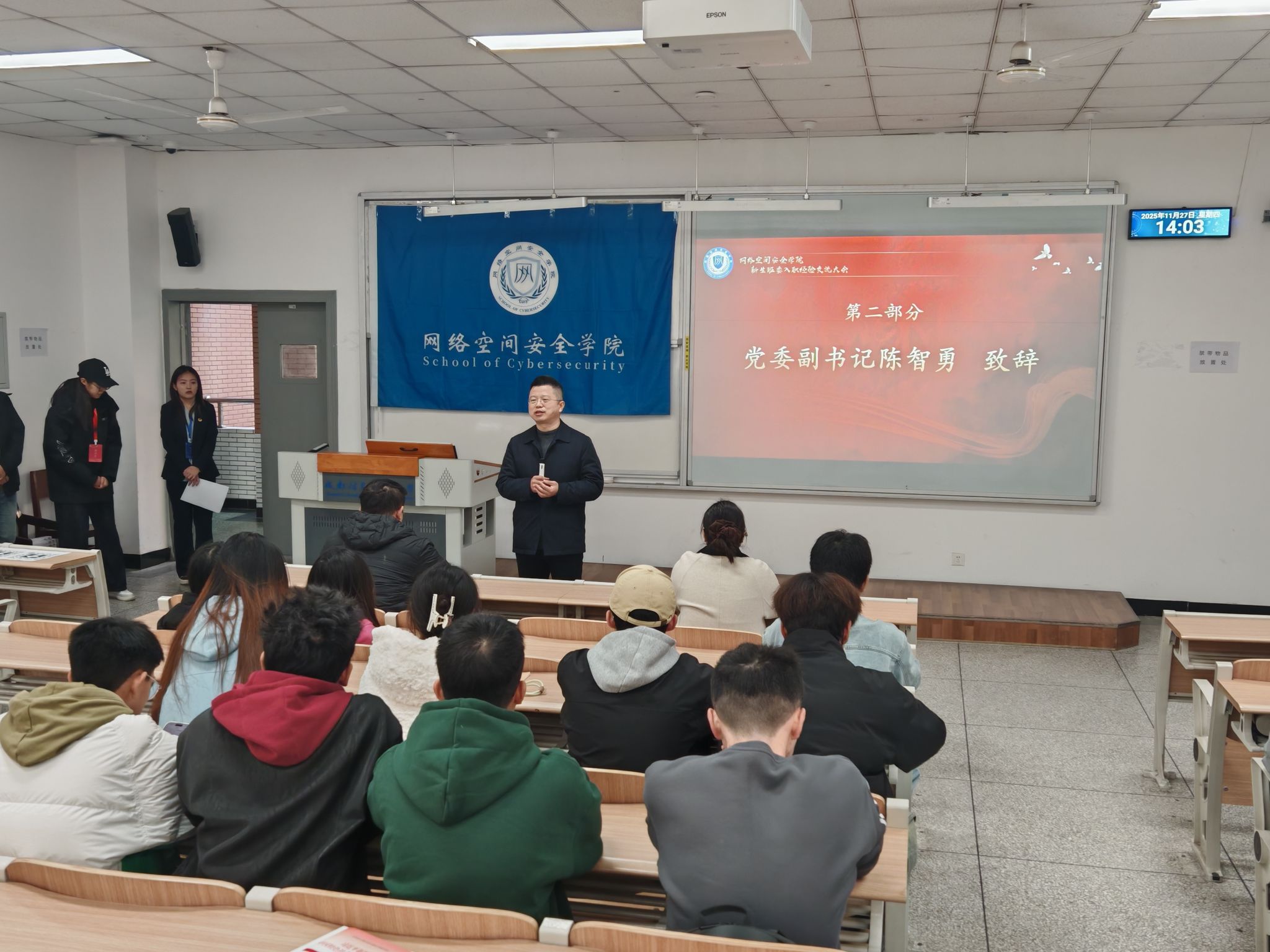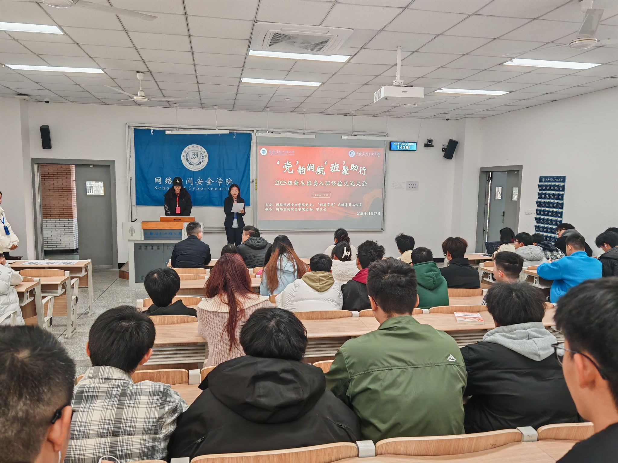 11月27日,网络空间安全学院2025级新生班委经验交流大会在H1107教室举办。本次会议由学院党委、“网盾育英”名辅导员工作室主办,学院团委、学生会承办,团委办公室负责落实。学院党委副书记陈智勇,团委书记、2025级辅导员夏焜,2024级辅导员韩阳,学生代表唐亚鑫、何光济、黄睿、潘星宇以及2025级班导生和班委参会。会议由团委办公室王玥主持。