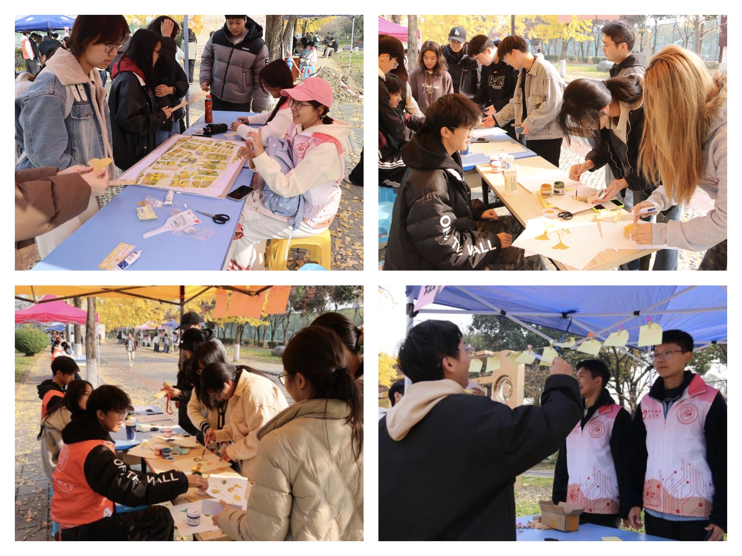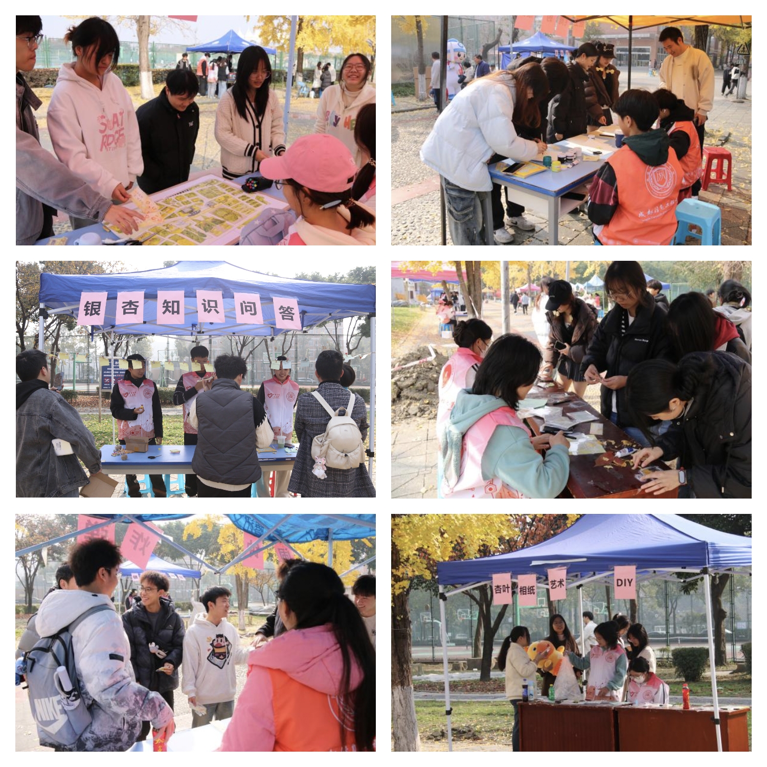 活动以银杏为媒,融艺术、趣味、创作为一体,为师生带来一场别开生面的秋日文化体验。“同心传字”考验团队默契,“秋风唱反调”比拼敏捷反应,“闹钟炸弹”环节笑声不断,“银杏知识问答”将自然教育与专业知识结合。手工创作区尤为受欢迎,同学们将一枚枚金黄的银杏叶转化为“纸上飞舞的银杏”画作与“杏叶艺术相纸”相框,在一粘一贴、一笔一画中感受手作的温度与创作的喜悦。