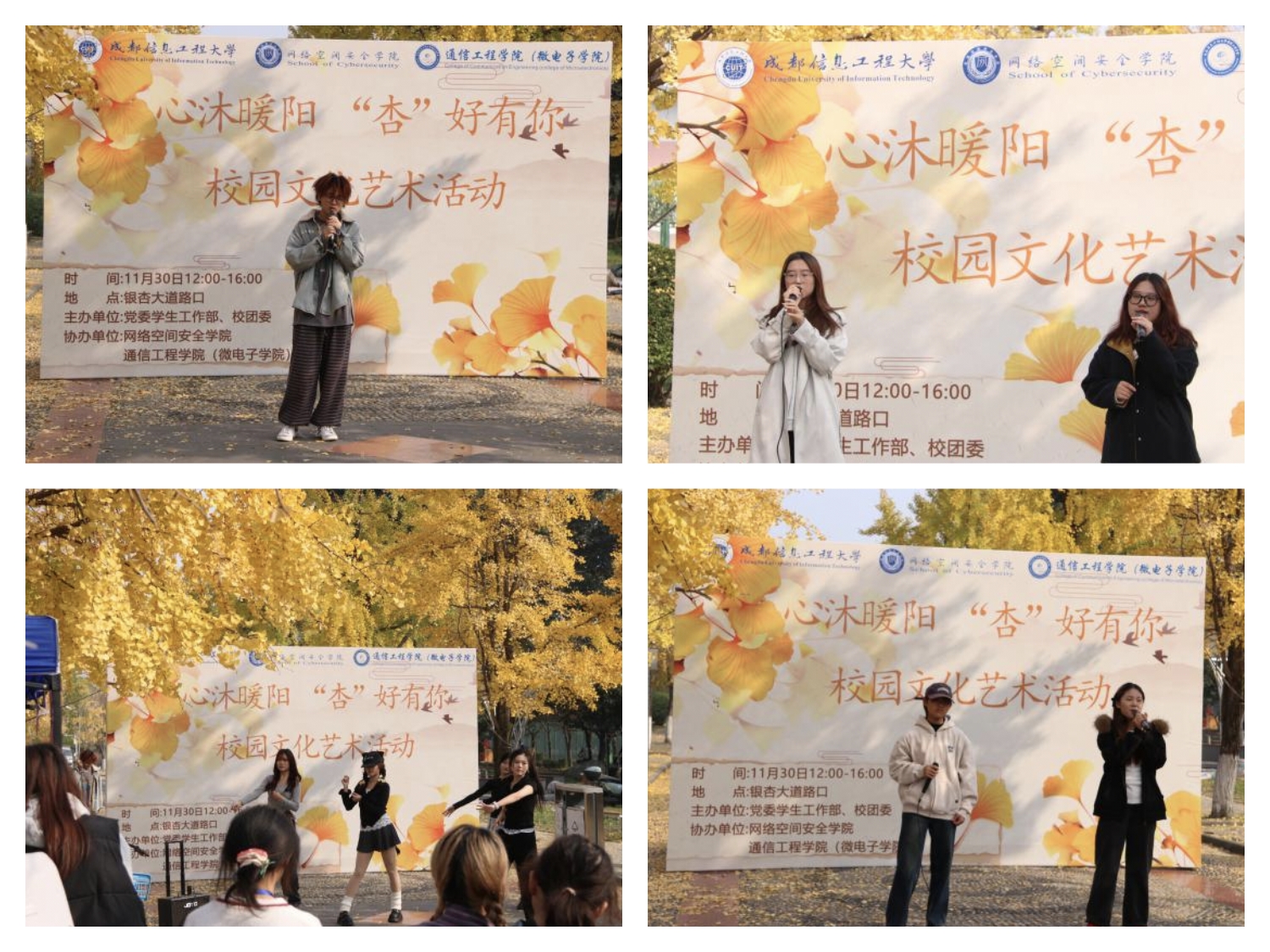 秋韵正浓,杏叶翩跹。11月30日,2025年“杏”好有你校园文化艺术活动在银杏大道温暖启幕。此次活动由学校党委学生工作部、校团委主办,网络空间安全学院与通信工程学院(微电子学院)联合承办。