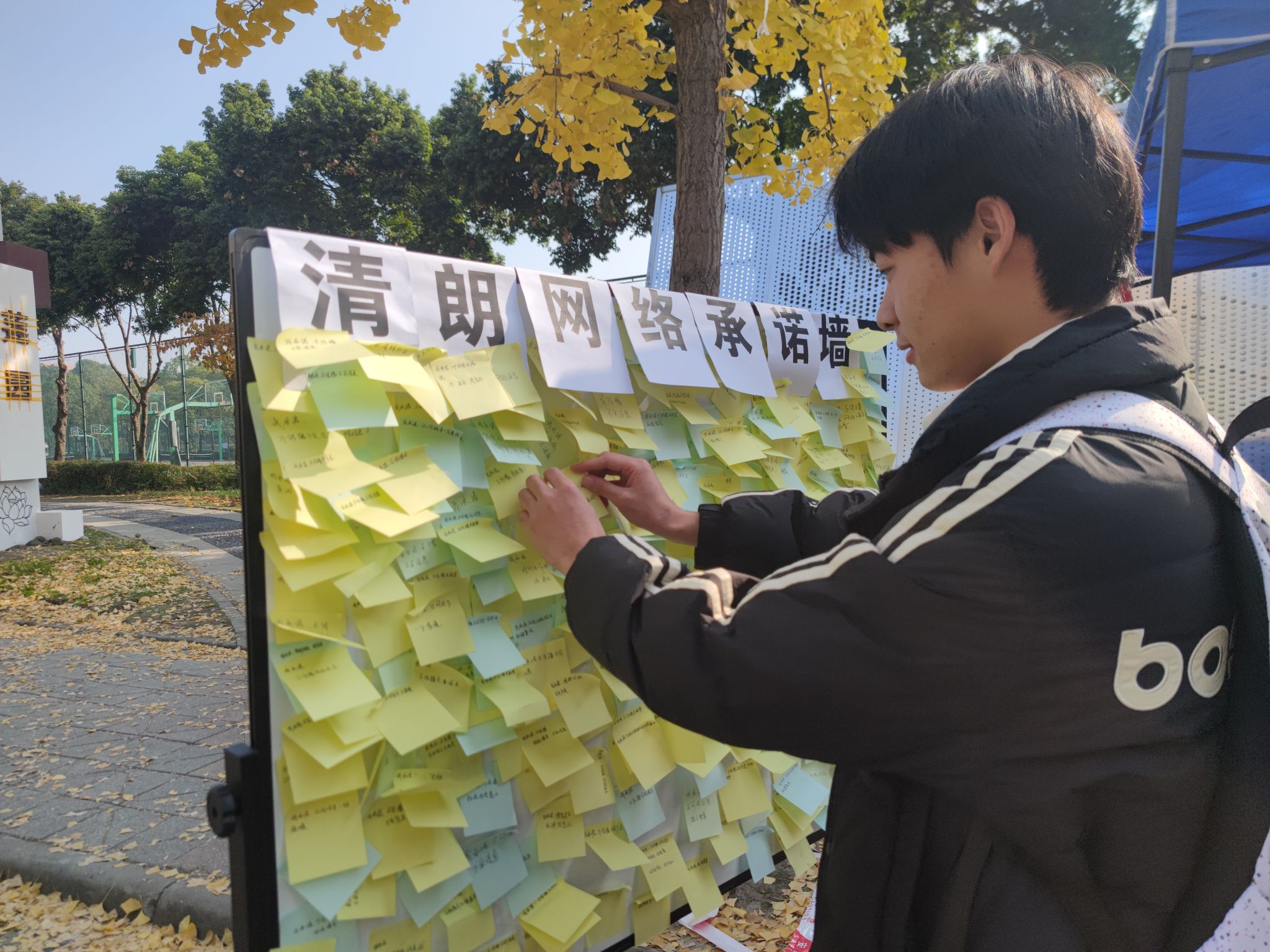 完成挑战后,参与者被引导至“清朗网络承诺墙”区域。此处以白板为载体,参与者可自主创作,在便利贴上写下维护网络文明的个人承诺并郑重粘贴至白板。承诺内容如“我承诺,自觉抵制网络谣言”“我承诺,理性发声不做键盘侠”等,凝聚了学子们对清朗网络空间的共同期盼。此外,还有身着网安院特色玩偶服的志愿者在旁积极引导、分发宣传资料。